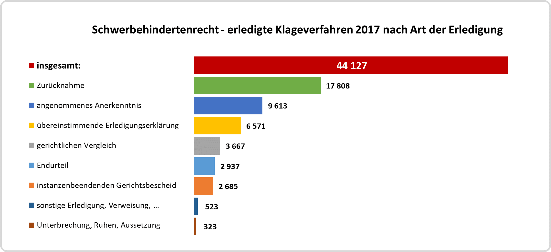 Von insgesamt 44.127 Erledigungen vor deutschen Sozialgerichten im Sachgebiet Schwerbehindertenrecht wurden im Jahr 2017 nur 2.937 (= 7 %) durch Urteil erledigt. Meist kam es zur Klagerücknahme (17.808 = 40 %), zum Anerkenntnis (9.613 = 22 %) oder zur übereinstimmenden Erledigung (6.571 = 15 %):