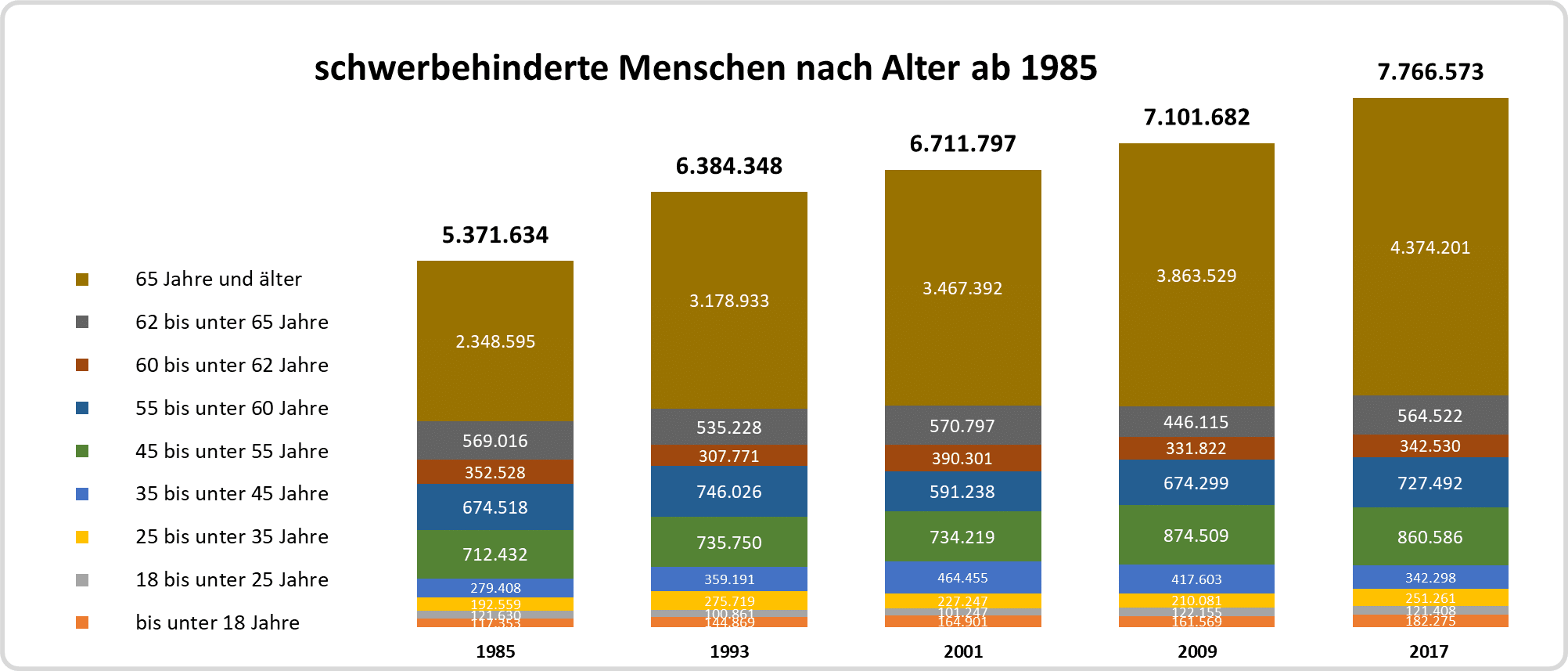 Die unterschiedliche Ausprägung der Zahl der schwerbehinderten Menschen nach Altersgruppen überrascht zunächst. Eine Behinderung soll doch nach der Definition in § 2 Abs. 1 S. 2 SGB IX vorliegen, wenn der Körper- und Gesundheitszustand von dem für das Lebensalter typischen Zustand abweicht. Der für das Lebensalter typische Zustand ist also im Vergleich mit anderen Menschen aus der Altersgruppe zu ermitteln. Dass hier innerhalb der Altersgruppen eklatant verschiedene Anteile bei der Schwerbehinderung vorliegen, ist meines Erachtens erklärungsbedürftig.