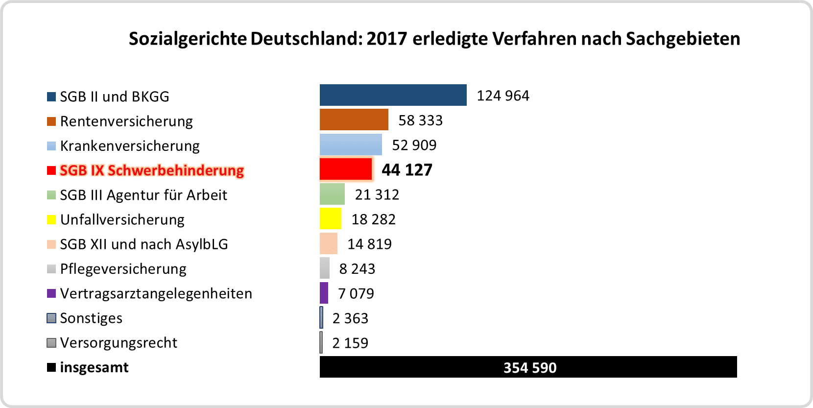 Das Schwerbehindertenrecht nahm 2017 mit rund 12 % aller Erledigungen (44.127 von insgesamt 354.590) in der Rechtsprechung der deutschen Sozialgerichte einen zahlenmäßig breiten Raum ein. Mit durchschnittlich rund 17.000 erledigten Streitverfahren jährlich ist es – nach Grundsicherung für Arbeitsuchende sowie Renten- und Krankenversicherung – das viertstärkste Rechtsgebiet bei den Sozialgerichten.