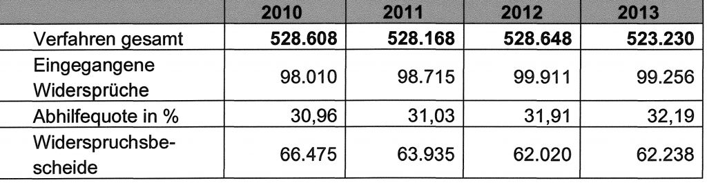 Gemäß dem oben bereits angesprochenen Bericht an den Landtag wurden 2013 99.256 Widersprüche registriert. Im Jahr 2013 sollen dann 62.238 ablehnende Widerspruchsbescheide erlassen worden sein. Die Abhilfequote lag gemäß dem Bericht bei 32,19 % (s. o., Bericht an den Landtag NRW, Seite 14):