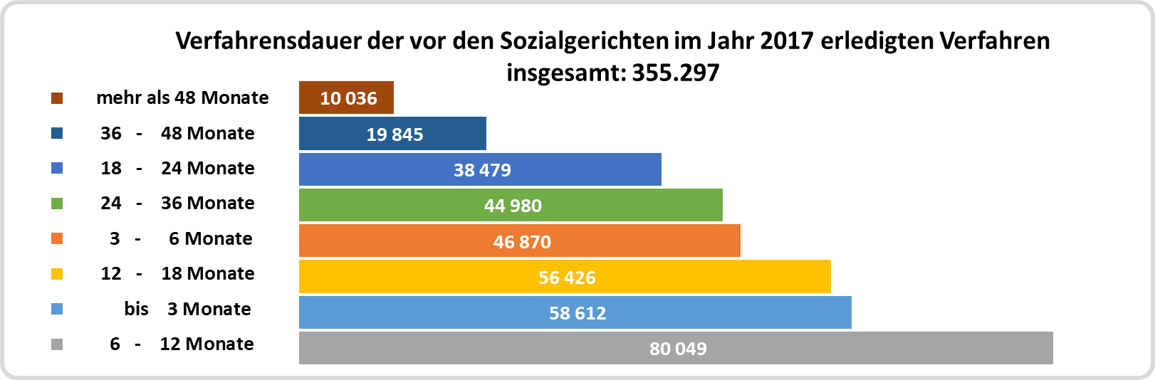 52 % der im Jahr 2017 vor den deutschen Sozialgerichten erstinstanzlich erledigten Klageverfahren konnten innerhalb von zwölf Monaten erledigt werden. Die durchschnittliche Verfahrensdauer betrug 15,1 Monate.