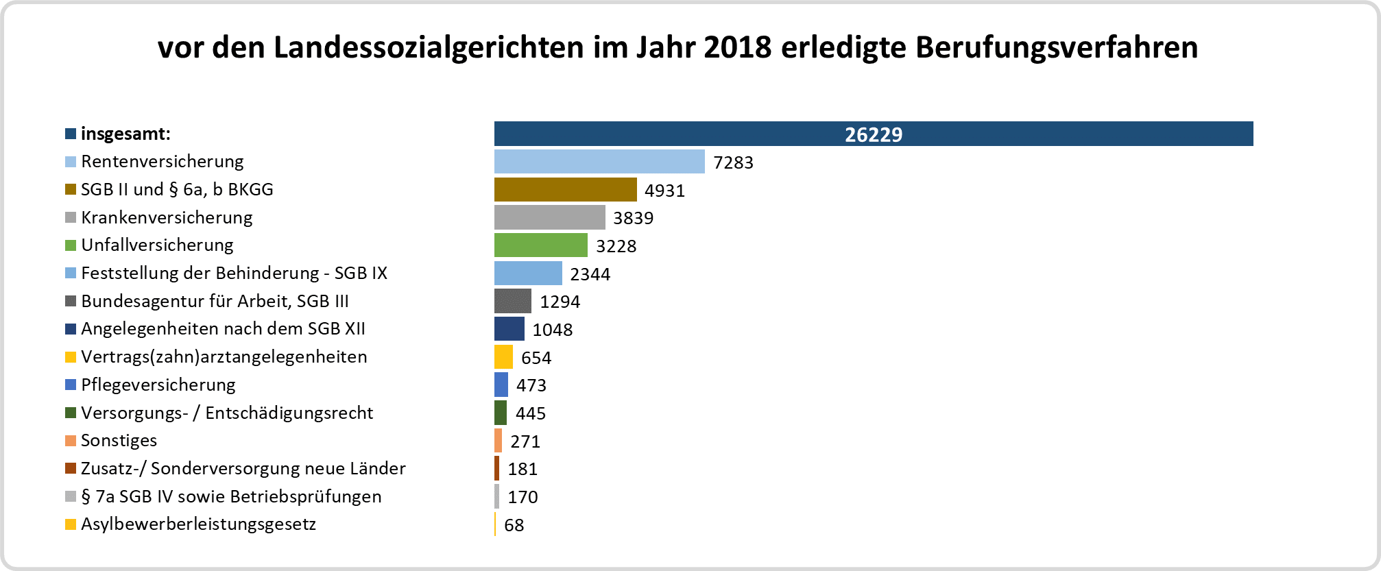 Die deutschen Landessozialgerichte konnten im Jahr 2018 insgesamt 26.229 Berufungsverfahren erledigen. Die Mehrzahl dieser Erledigungen stammten aus den Gebieten Rentenversicherung (7.283), Hartz 4 (4.931) und Krankenversicherung (3.839):