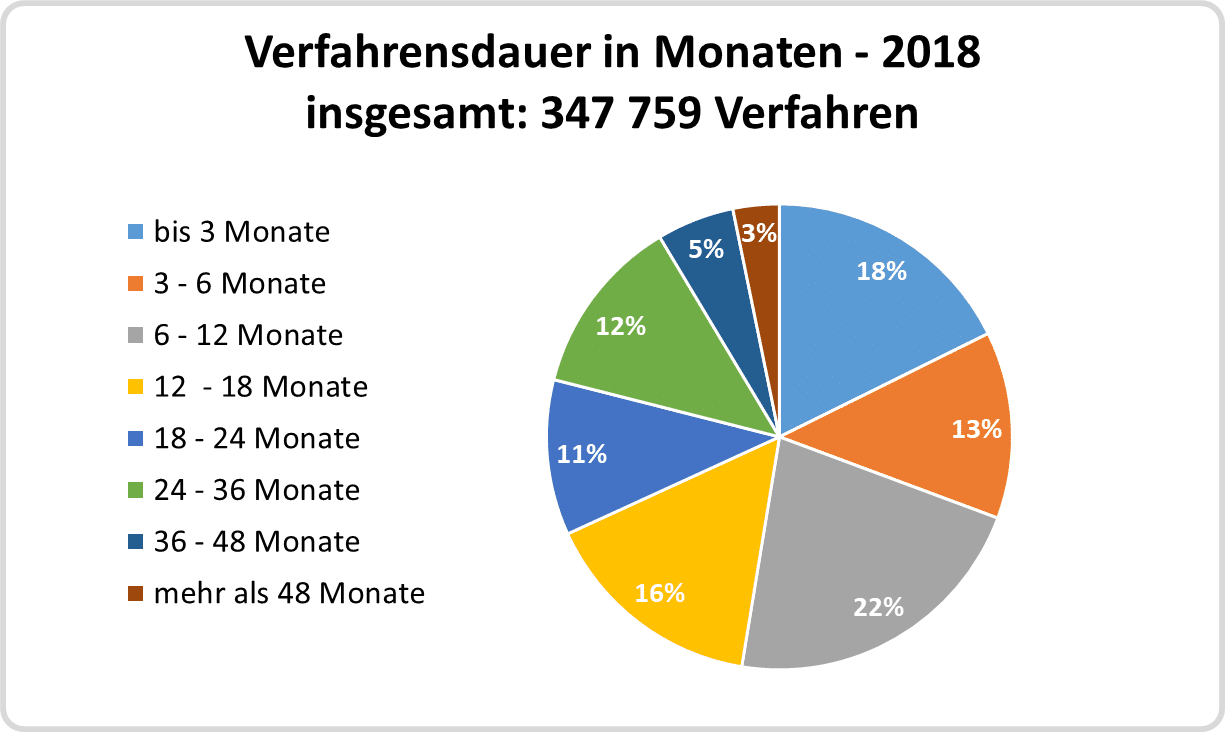 Die durchschnittliche Verfahrensdauer betrug hier 1,1 Monate (Datenquelle: Statistisches Bundesamt, Publikation vom 16. September 2019, Fachserie 10 Reihe 2.7- 2018, 3_3).