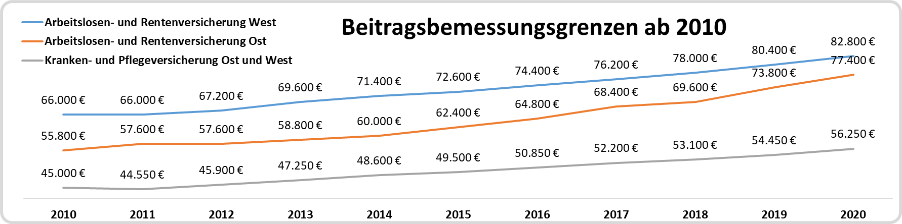Die nachfolgende Tabelle zeigt die Entwicklung der Beitragssätze der Arbeitslosenversicherung, der Krankenversicherung, der Rentenversicherung sowie der Pflegeversicherung in der zeitlichen Entwicklung ab 2010. Die Gesamtbelastung liegt in den letzten zehn Jahren zwischen 39,5 und 40,4 % (ohne den Zusatzbeitrag bei der Krankenversicherung und ohne die Beiträge zur gesetzlichen Unfallversicherung):