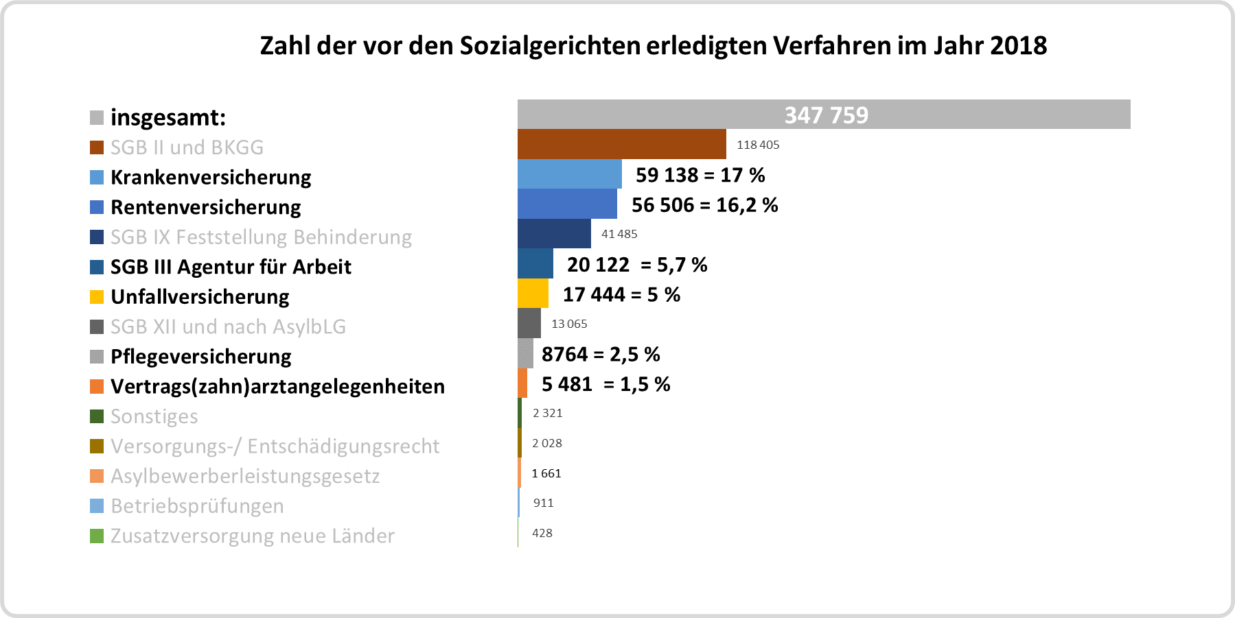 45,6 % der insgesamt bei den Sozialgerichten im Jahr 2018 erledigten Klageverfahren (347.759) stammen aus dem Sozialversicherungsrecht (Arbeitslosen-, Kranken-, Renten-, Unfall- und Pflegeversicherung).
