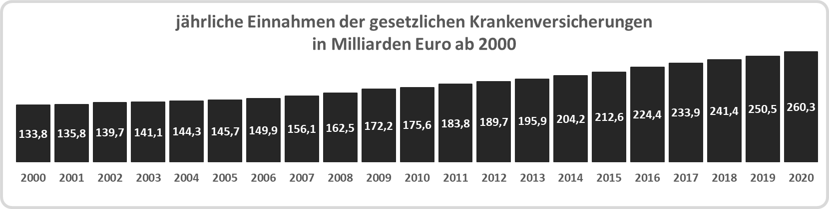 Die Einnahmen der gesetzlichen Krankenversicherung erhöhten sich von ca. 133 Milliarden Euro im Jahr 2000 auf über 242 Milliarden Euro im Jahr 2018.
